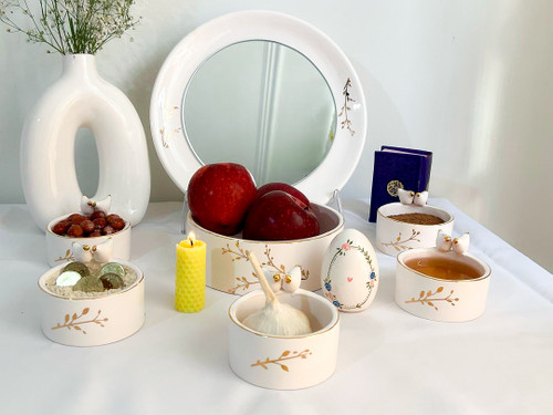 ست هفت سین دست ساز سرامیکی خوشه طلا مزین با طلای ۱۲ عیار شامل یک کاسه بزرگ و ۵ کاسه کوچیک همراه آیینه