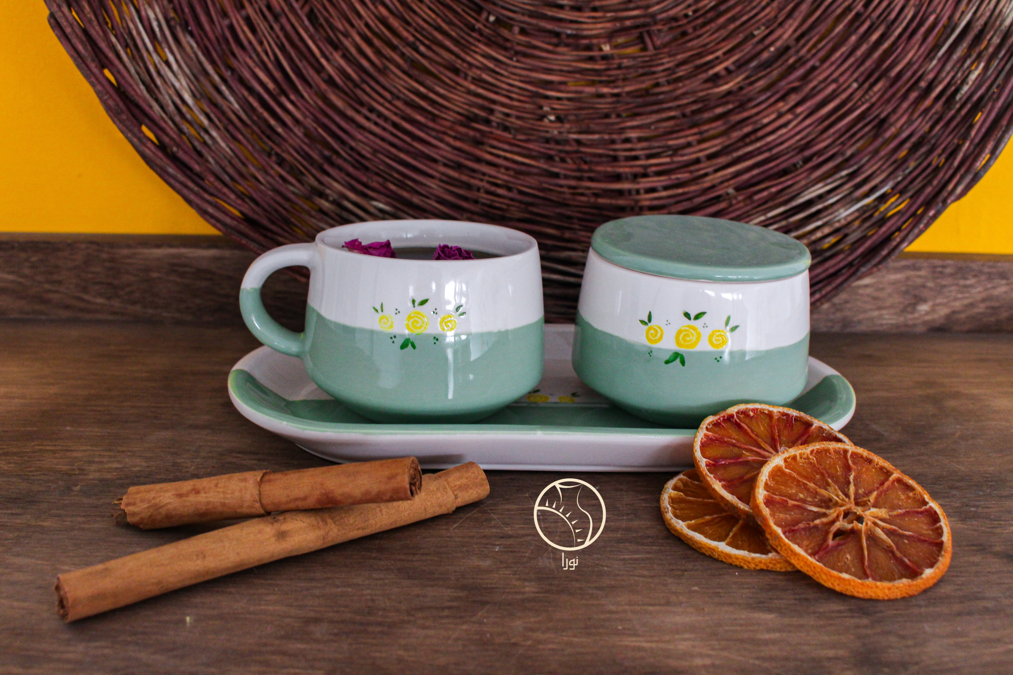 ست چایی خوری سرامیکی دست ساز آفتابگردان ۲ نفره همراه قندون